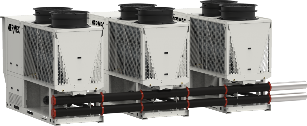 Grazie alla presenza di appositi collettori idronici modulari ed alle evolute funzioni di regolazione e di sicurezza, la pompa di calore PRM può essere collegata agevolmente in parallelo con altre unità identiche a formare una centrale termo-frigorifera in grado di servire impianti di tutte le taglie.