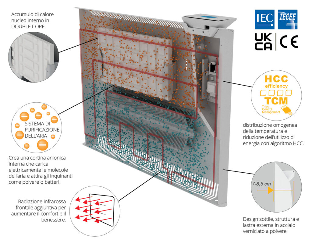 - Sistema DOUBLE-CORE per l’accumulo del calore che stabilizza la temperatura e riduce il consumo.