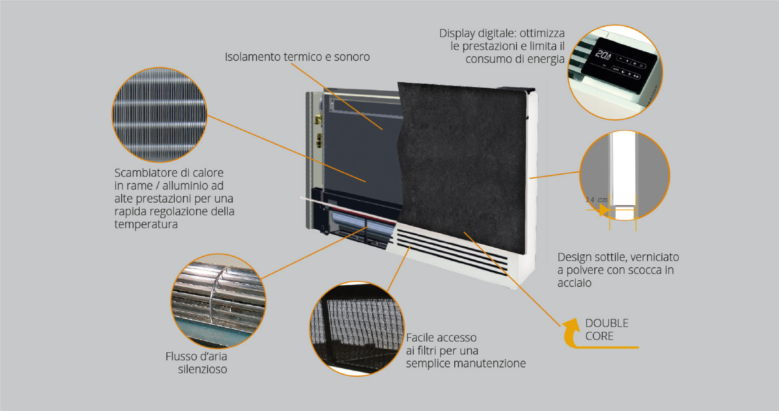 Il sistema DOUBLE-CORE consente un aumento molto rapido della temperatura ambiente ed è in grado di mantenere il calore molto più a lungo di qualsiasi tipo di riscaldamento.