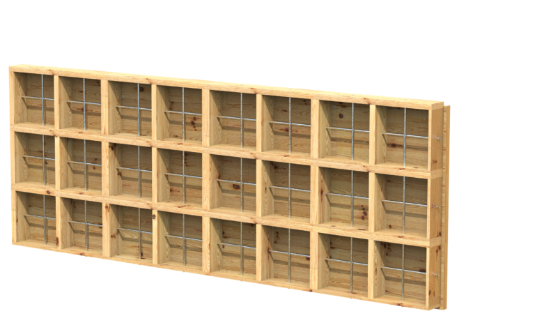 - Il sistema interno di BioBuildingBlock di barre di acciaio e cilindri permette il serraggio di biomattoni adiacenti realizzando una parete in legno armato, che garantisce robustezza costruttiva per resistere ad eventi sismici e uragani con venti oltre i 250km/h
