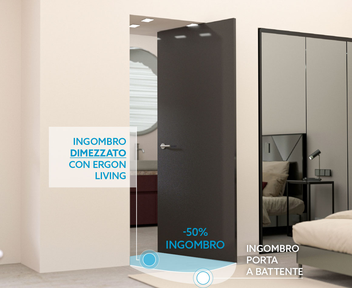 ERGON® LIVING rappresenta una rivoluzione nel mondo delle porte interne. Questo innovativo sistema di apertura rototraslante combina un movimento simultaneo di rotazione e traslazione, riducendo l’ingombro fino al 50% rispetto alle porte tradizionali.