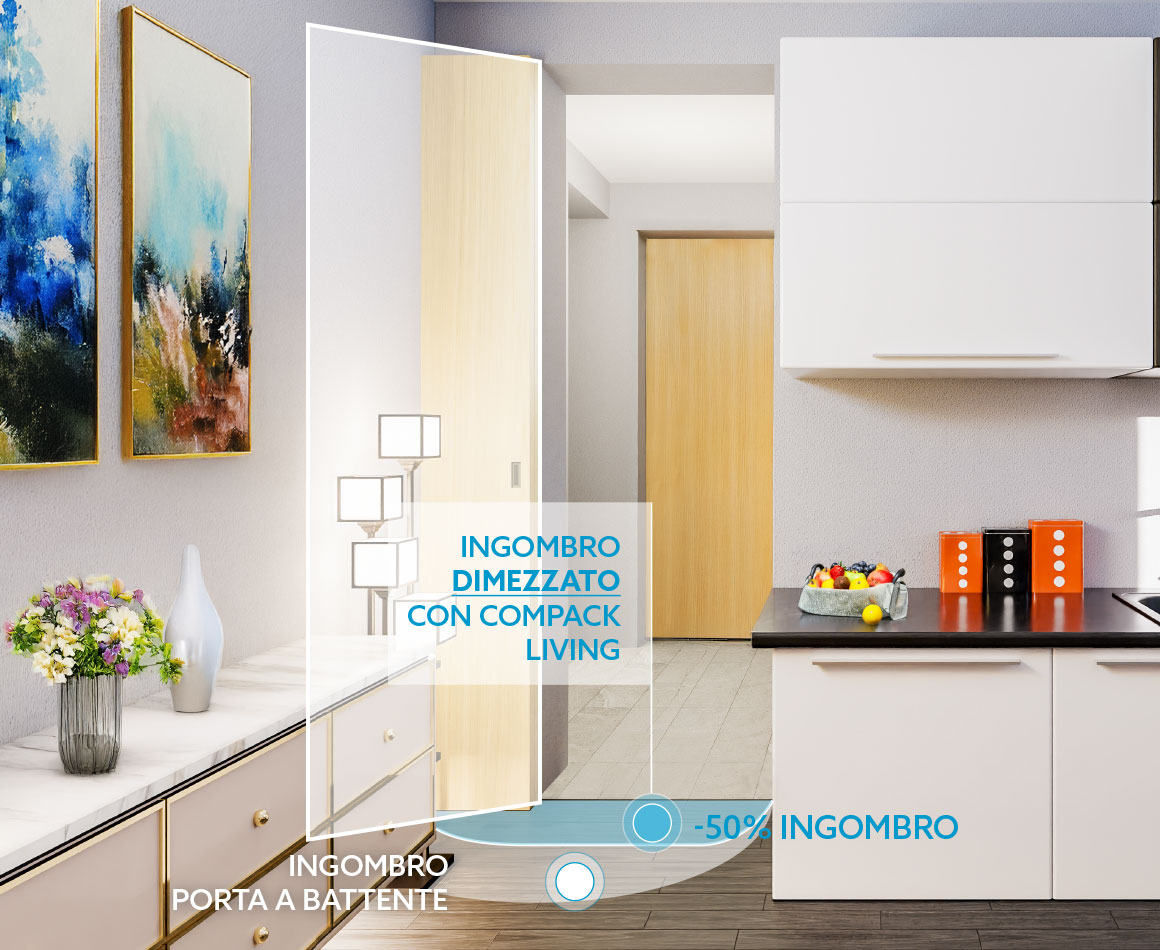 Il sistema COMPACK LIVING®180 è la soluzione ideale per chi desidera ottimizzare gli spazi senza rinunciare all’eleganza e alla funzionalità. Grazie a un esclusivo meccanismo pieghevole, l’anta della porta ruota di 180°, restando perfettamente parallela alla parete. Questa caratteristica consente di eliminare l’ingombro frontale e laterale, rendendo l’ambiente più ordinato e facile da vivere.