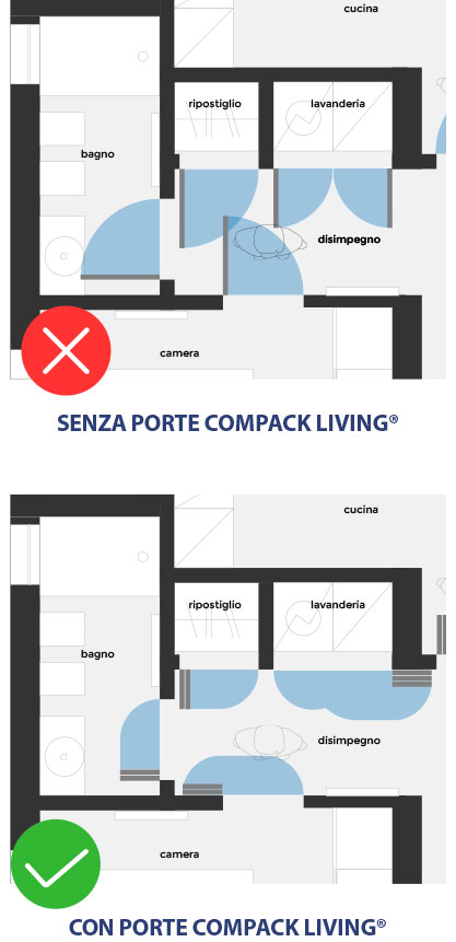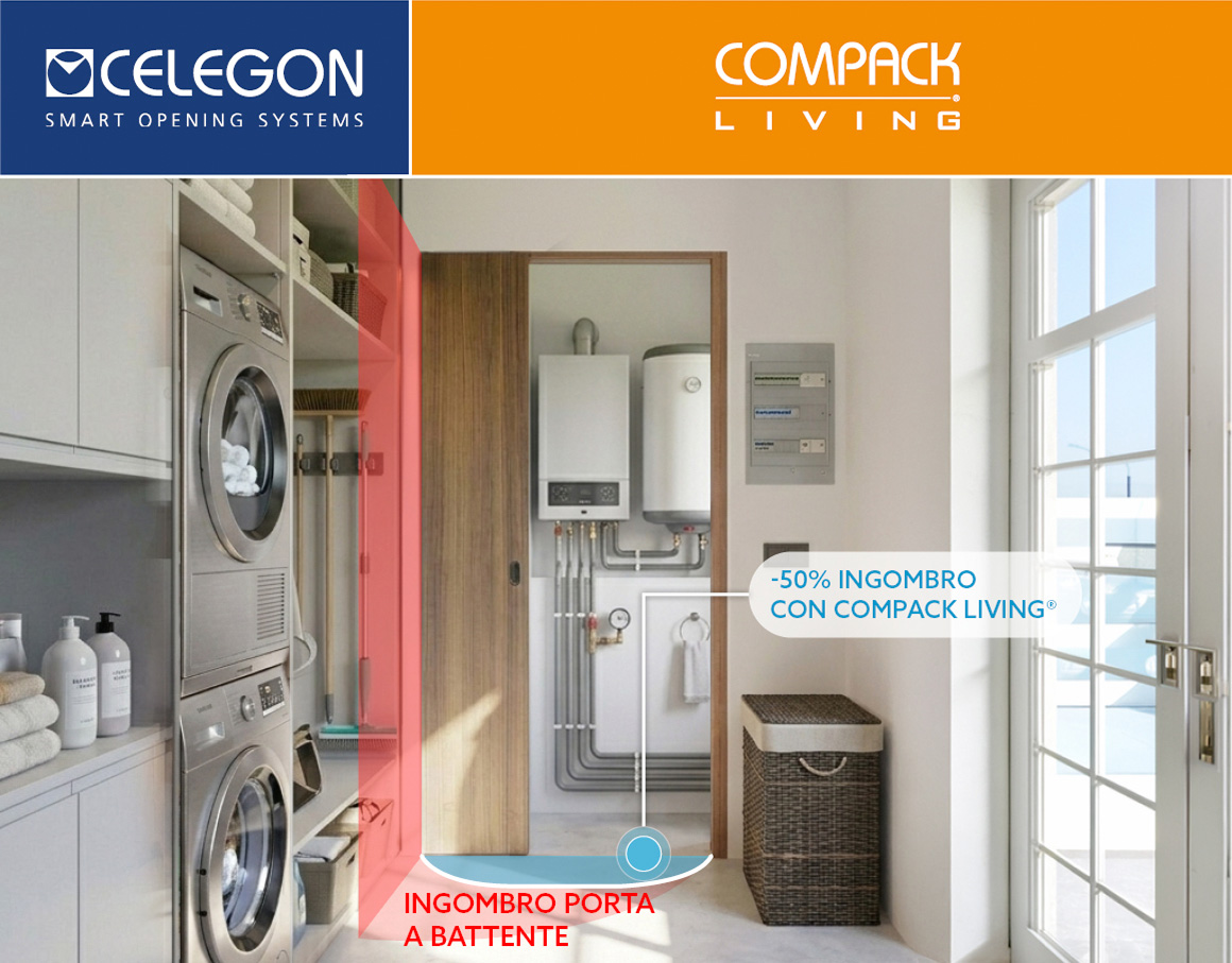 Che si tratti di nascondere una lavanderia domestica, chiudere una nicchia impiantistica o organizzare una cabina armadio, i sistemi Compack® dimostrano come una soluzione di apertura intelligente possa migliorare concretamente la fruibilità degli spazi disponibili. Compack®, riducendo gli ingombri e semplificando l’accesso agli ambienti o ai vani di servizio, rappresenta una nuova tecnologia che permette di sfruttare al meglio ogni metro quadrato della casa, trasformando un importante elemento funzionale in parte integrante del progetto abitativo.