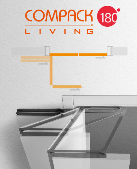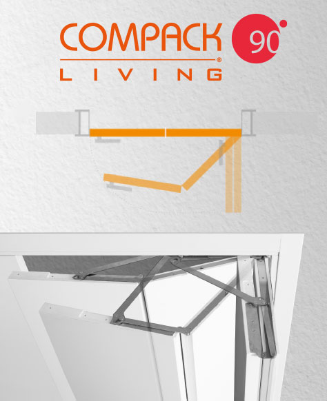 II sistema è disponibile anche nella configurazione Compack Living® 90°, pensata per contesti in cui non sono disponibili pareti laterali. Con Compack Living® ad apertura a 90° l’anta, dopo il ripiegamento, rimane ortogonale alla parete, offrendo una soluzione compatta e facilmente integrabile accanto a mobili, piani di lavoro o superfici attrezzate.