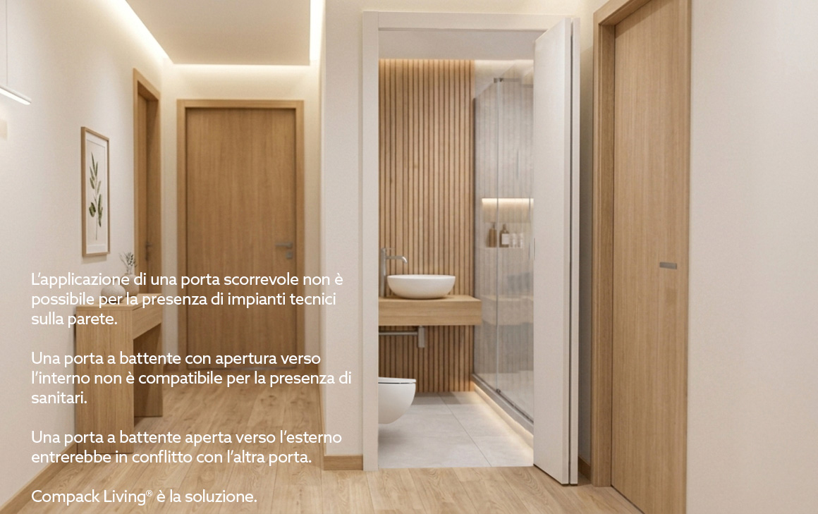 Un ulteriore vantaggio dei sistemi Compack® è la continuità estetica che consentono di ottenere negli ambienti domestici. A differenza di molte chiusure tecniche, che spesso risultano visivamente separate dal resto dell’arredo, Compack® permette di utilizzare ante per porte interne perfettamente coordinate con le porte presenti negli altri ambienti della casa. In questo modo anche nicchie tecniche, cabine e vani contenitore diventano parte integrante del progetto, contribuendo a mantenere ordine visivo e coerenza stilistica.
