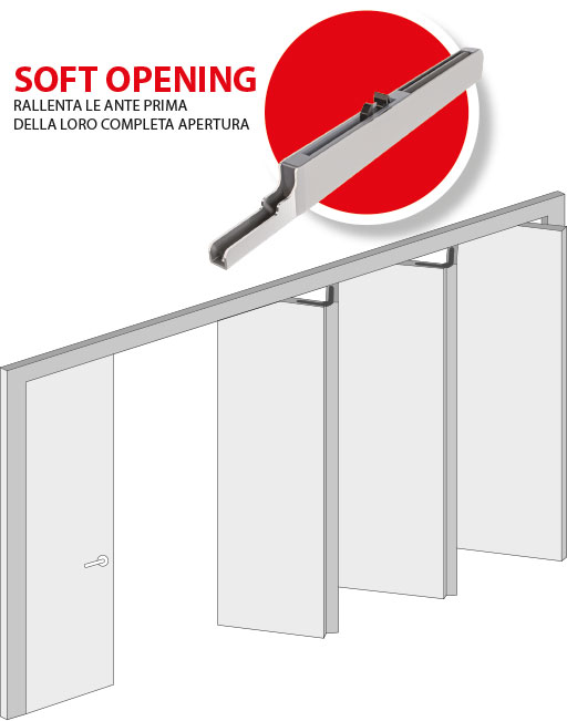 • apertura controllata attraverso l’applicazione dello speciale ammortizzatore Soft-opening che permette la gestione semplificata anche di ante con dimensioni e pesi rilevanti;