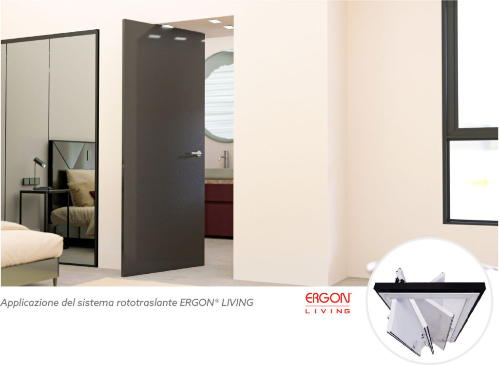 Il sistema ERGON® LIVING è una rivoluzionaria ferramenta per porte ad apertura rototraslante che riduce del 50% l’ingombro della soglia, ampliando lo spazio abitativo senza necessità di interventi murari. Grazie al movimento simultaneo di rotazione e traslazione dell’anta, questo sistema offre un’apertura su entrambi i lati e un funzionamento a spinta, semplice e agevole, eliminando i problemi di conflittualità tra le soglie e ampliando le possibilità di arredamento.