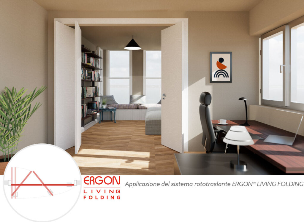 Il sistema ERGON® LIVING FOLDING rappresenta un’innovativa soluzione per l’ottimizzazione degli spazi abitativi. Questo sistema di ante mobili, caratterizzato da un movimento simultaneo di rotazione e traslazione dell’anta, offre una gestione fluida degli spazi interni, eliminando i conflitti con le soglie e facilitando il passaggio tra le stanze. Con possibilità di realizzare pareti divisorie con ante rototraslanti, fino a sei metri, questo sistema permette di suddividere gli ambienti con un movimento silenzioso e stabile, senza impatto sul pavimento.