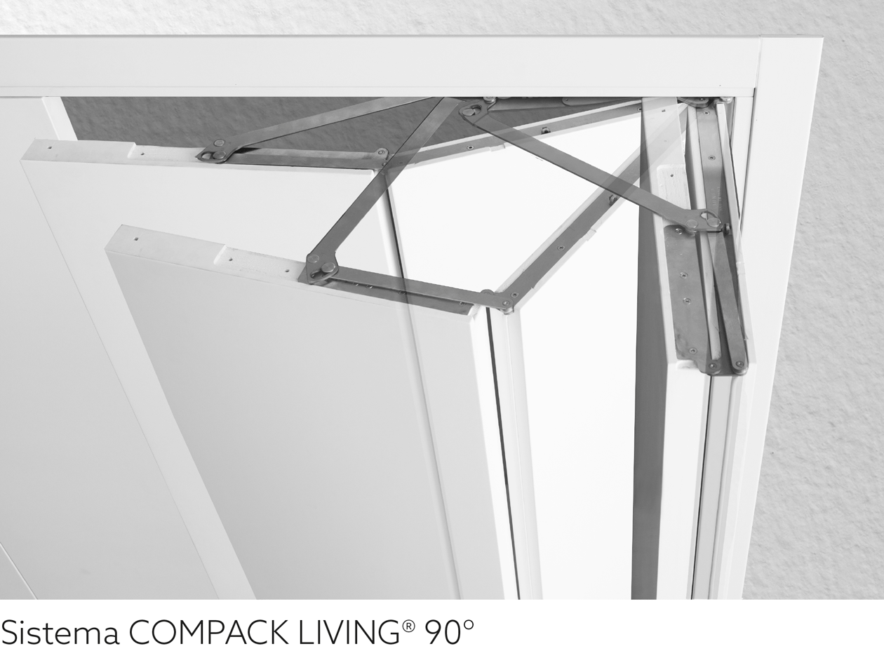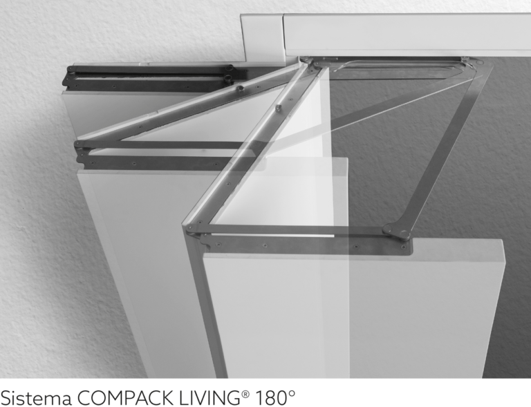 COMPACK LIVING®: Si tratta di un programma di aperture pieghevoli che supera il concetto del carrello/binario tramite l’impiego di una cerniera innovativa a doppio compasso.