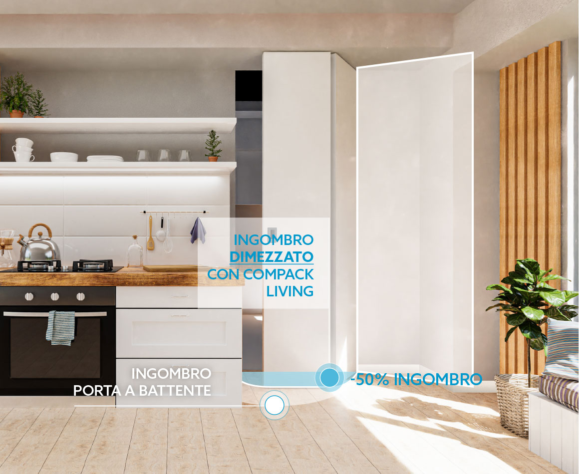 COMPACK LIVING® 180 è il sistema di ferramenta per porte interne pieghevoli che ridefinisce l’idea di apertura. Grazie alla sua esclusiva cerniera brevettata, l’anta può aprirsi completamente e posizionarsi