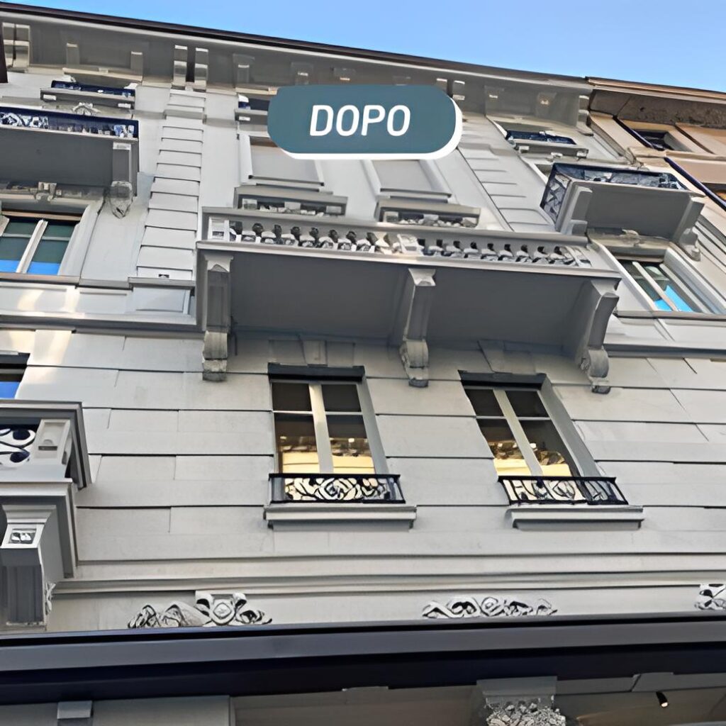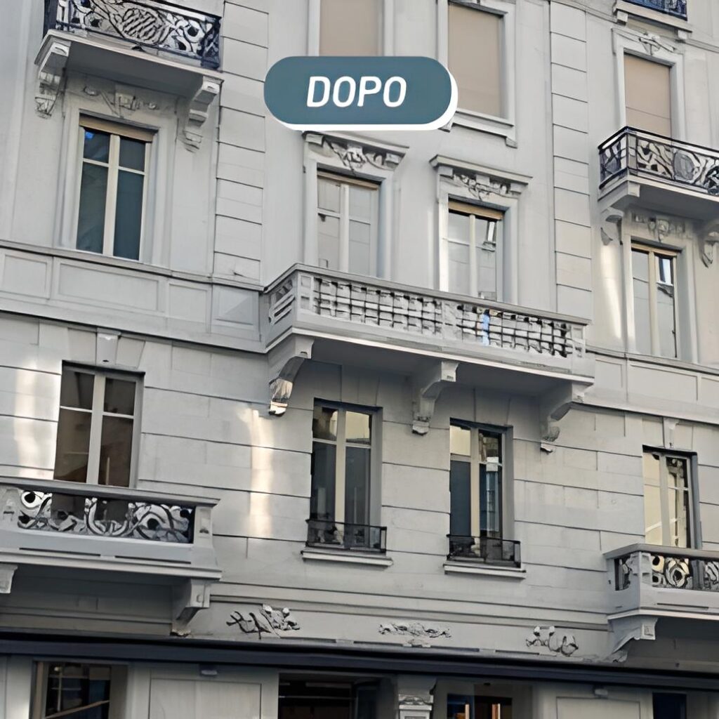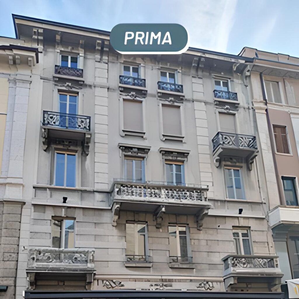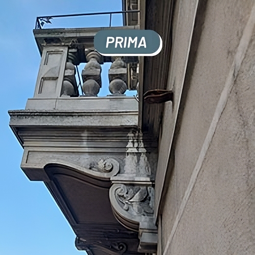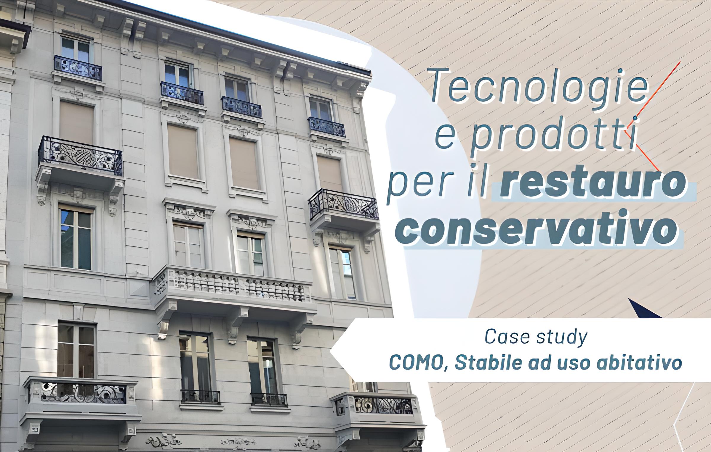 La facciata di questo stabile di Como è composta da diversi supporti (cementizi , granito e lamiera) che presentavano diffusi depositi di natura inorganica (smog, pulviscolo ambientale) e organica (muffe, muschi e licheni).