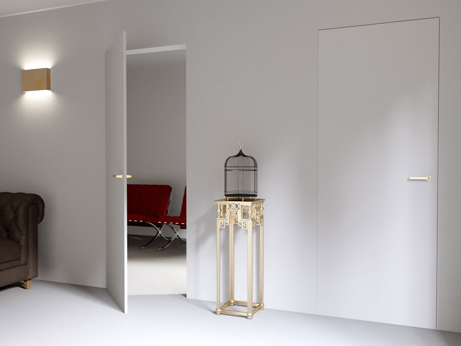 Priva di orpelli e fronzoli, la porta, in questo modo, diventa totalmente invisibile, realizzando otticamente, ed esteticamente, una perfetta continuità con la parete che le accoglie.