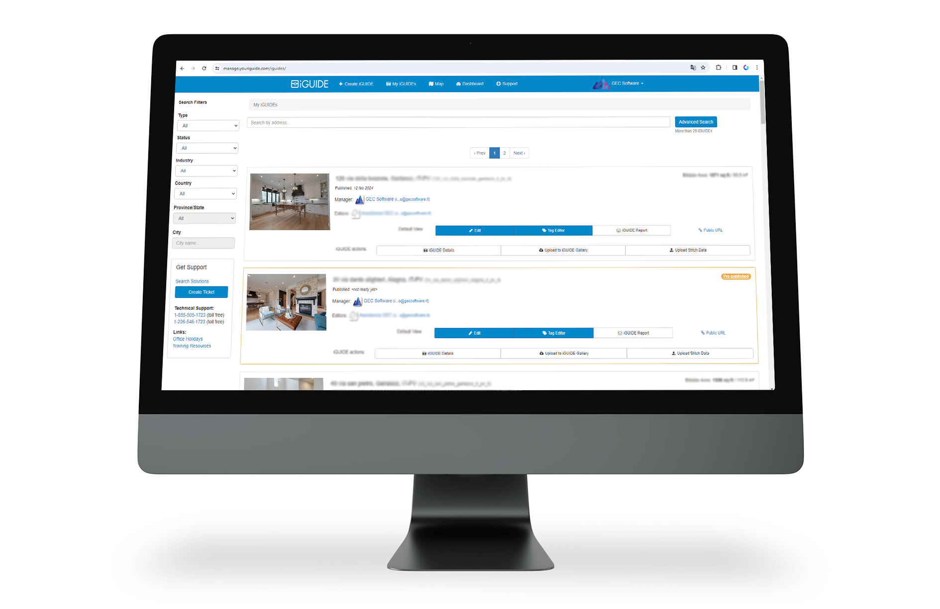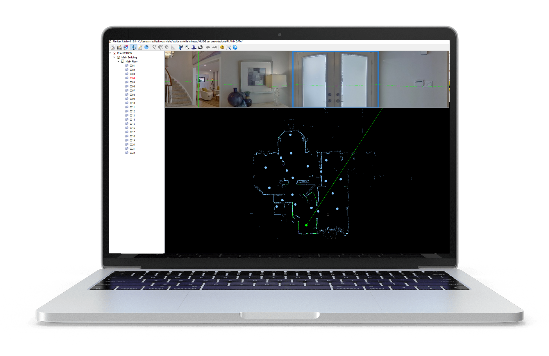 Dopo aver terminato il rilievo sul campo, in ufficio carichi le scansioni in Stitch. Questo software, incluso con iGUIDE®, ha la funzione di aiutarti a gestire le fotografie 360 prodotte dalla fotocamera e ad impostare dei settaggi che serviranno allʼintelligenza artificiale per realizzare il tuo tour 3D. Lʼelaborazione di questi dati può essere lasciata alle impostazioni automatiche oppure puoi decidere tu stesso cosa mostrare o meno nel tour 3D immersivo.
