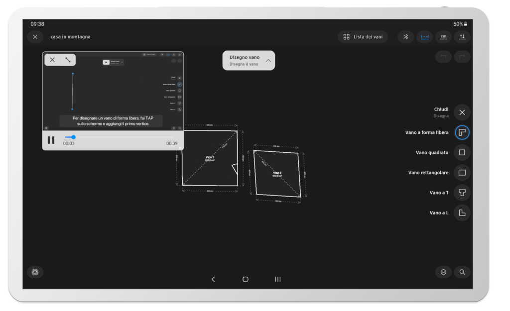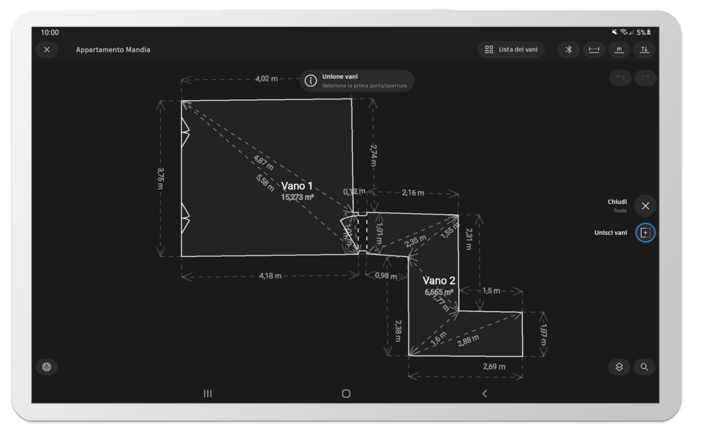 Puoi misurare anche muri storti e pareti fuori squadro; con un semplice TAP sul comando “Risolvi”, il software provvederà alla risoluzione automatica dei vani. Tu devi solo preoccuparti di disegnare i vani, inserire le diagonali e prendere le misure.