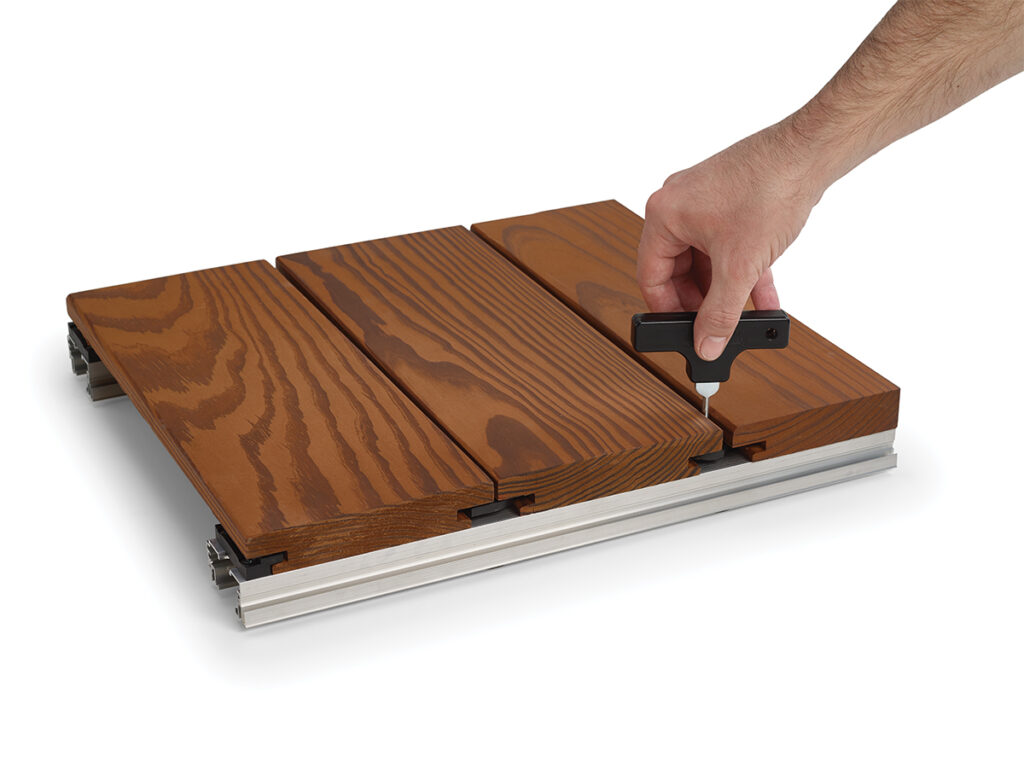 Sistema d’installazione iDecking che permette, unico al mondo, di rimuovere e reinserire ogni doga in qualsiasi punto dei pavimenti per esterni iDecking Revolution, senza bisogno di ricorrere a personale specializzato: basta la chiave speciale in dotazione e il gioco è fatto. Il Sistema EasyChange rende totalmente inutile l’utilizzo di trapani avvisatori, distanziatori, viti, colle o clips tradizionali per il montaggio. I supporti speciali del brevetto EasyChange annullano ogni rischio di errore durante la posa in opera, garantiscono una notevole riduzione nei tempi e aumentano la globale stabilità del lavoro finito.