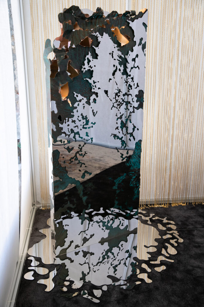 Accanto a Flow, un’opera in cui ritorna protagonista la materia e la sua sperimentazione, il desiderio di suscitare emozioni: Issiba, monolite specchiante disegnato da Matteo Tampone.