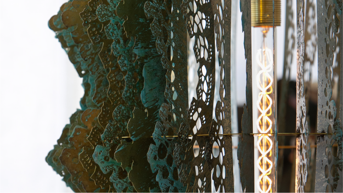 Agli archi altrettante lastre mostrano la superficie lunare e l’insieme di pianeti fluttuanti nello spazio in un pannello decorativo, Flow, disegnato per PLANIUM da Donatella Nobilio e creato ad intarsio con diversi metalli: Calamina, Acciaio, Ottone e Rame.