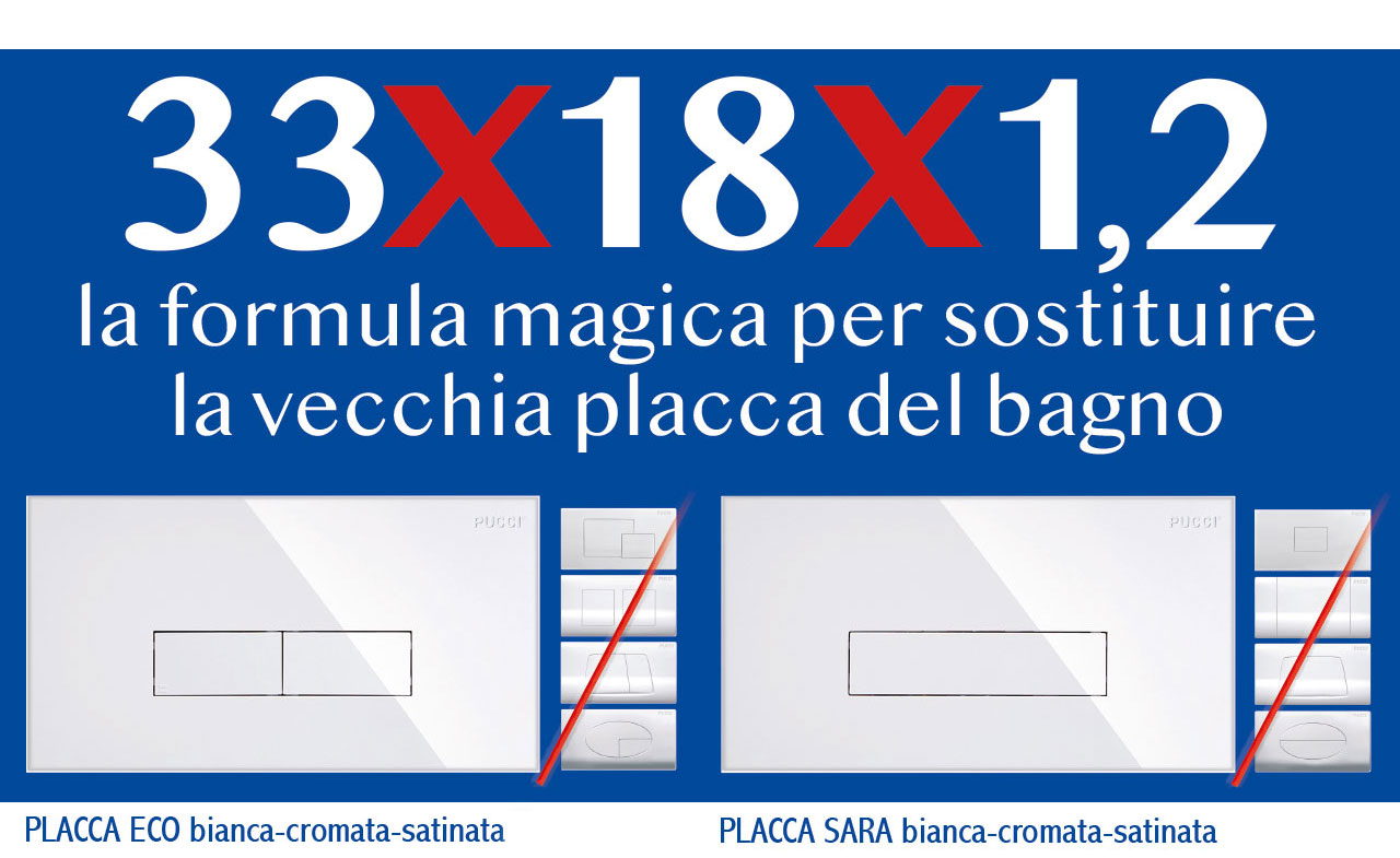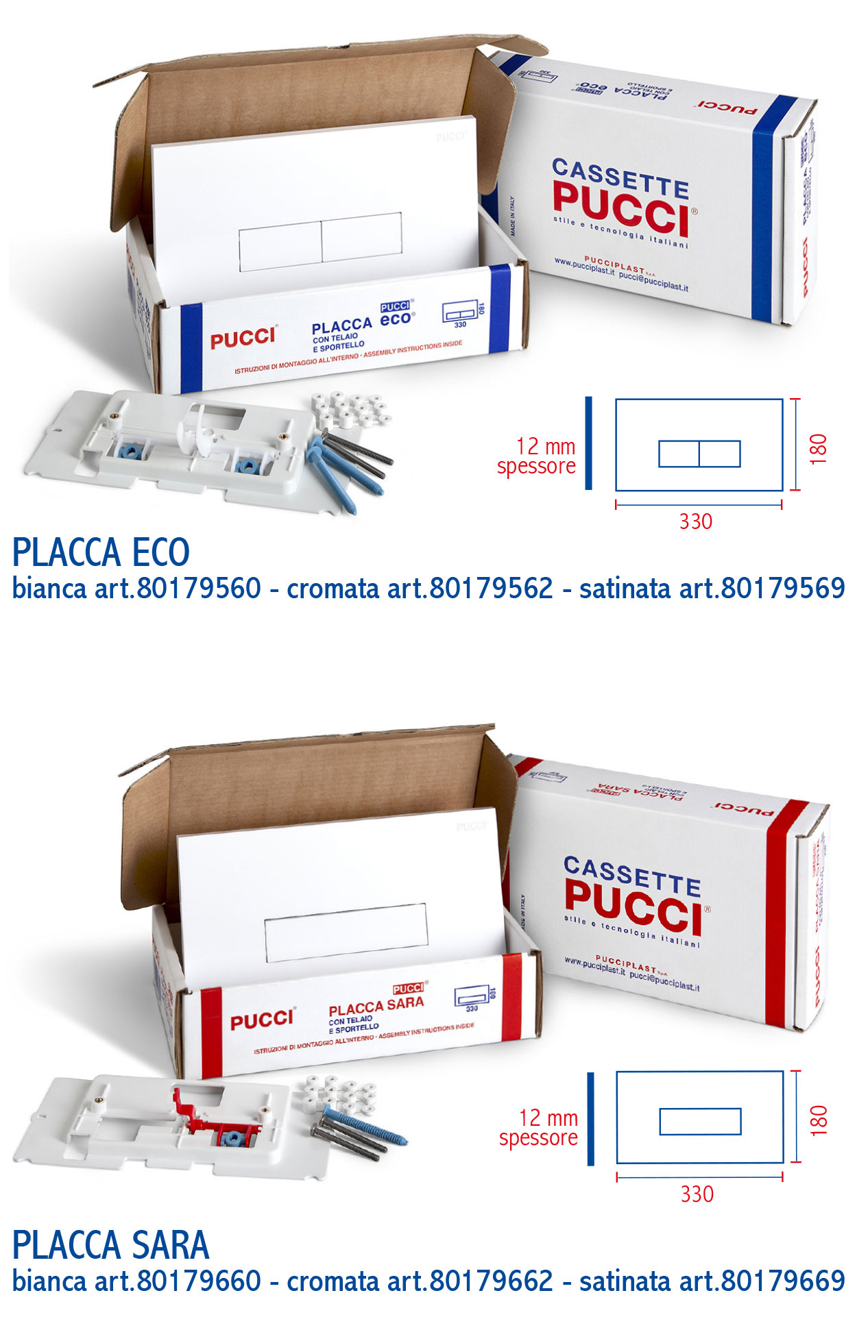 Chi ha installato nel proprio bagno una cassetta Pucci, Eco a doppio tasto oppure Sara, fino all’anno 2010, dotata di placca di dimensione 330×180 mm, può sostituire in modo facile e veloce la placca con un modello delle stesse dimensioni, ma molto più sottile, 12 mm, e molto più contemporaneo sotto il profilo del design.