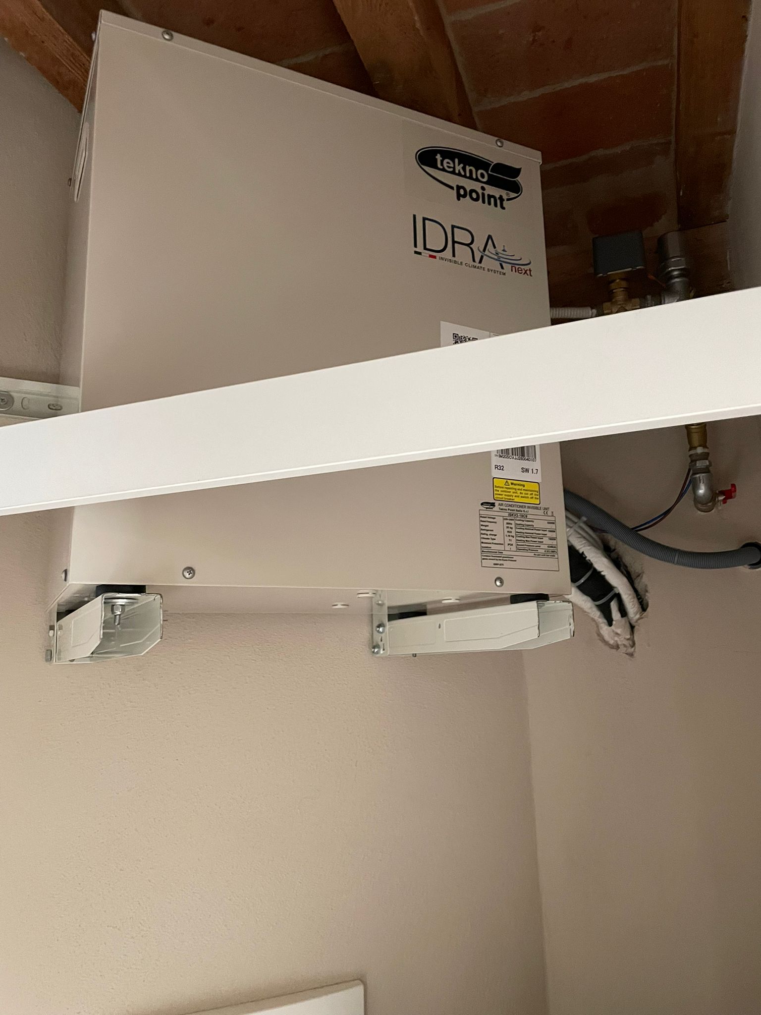 Per rispondere al vincolo progettuale è stato adottato il sistema di climatizzazione ad acqua in pompa di calore progettato per funzionare senza unità esterna: IDRA Next Dual Split da 18.000 Btu.